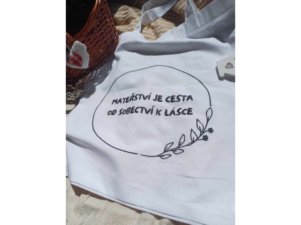 Plátěná taška s výšivkou "Mateřství je cesta od sobectví k Lásce".