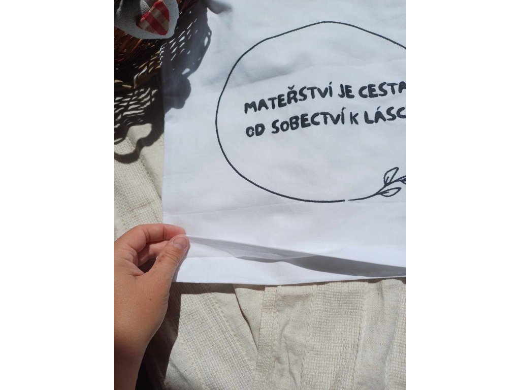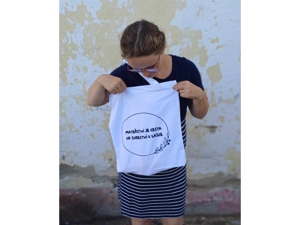 Plátěná taška s myšlenkou "Mateřství je cesta od sobectví k Lásce"